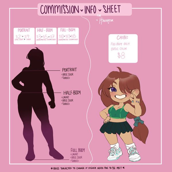 >Full BodyNext: Please tell me if you want it just LINEART, BASIC COLOR, or SHADED. Chibi will always be FULL BODY + BASIC COLOR. This will greatly affect how much time I will need and what you are looking for.That's it! Click below for Terms of Service, see art examples, or go back to the home page!